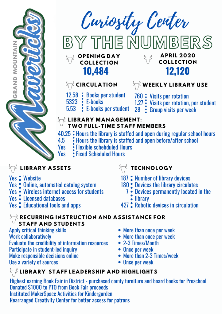 I am also including the End-of-Year (EOY) Statistics I created for SCHL 5160: Managing School Library Programs because this was a great way to demonstrate to my evaluators the impact our library had on our patrons, even during a pandemic. I am revising this artifact for my EOY evaluation in a few weeks.
