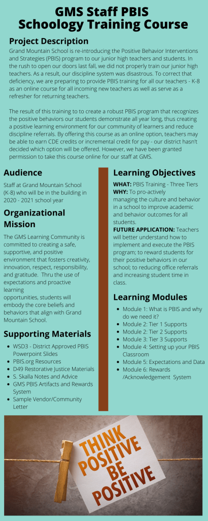 For this competency, I am sharing the procedural steps I used to develop my PBIS course from INTE 5200: Crafting eLearning Experiences. The work I developed for my PBIS Schoology course was intense because although I knew how to maneuver the Schoology platform, I wasn’t comfortable with it. I’ve been a Google Classroom user from the inception of the tool and switching over to Schoology was like going to the dentist for a root canal. I went kicking and screaming. However, in the course INTE 5200: Crafting eLearning, I had a tremendously kind instructor who held my hand with making Schoology more user-friendly from the developer side and making it more appealing for the end-user as well.